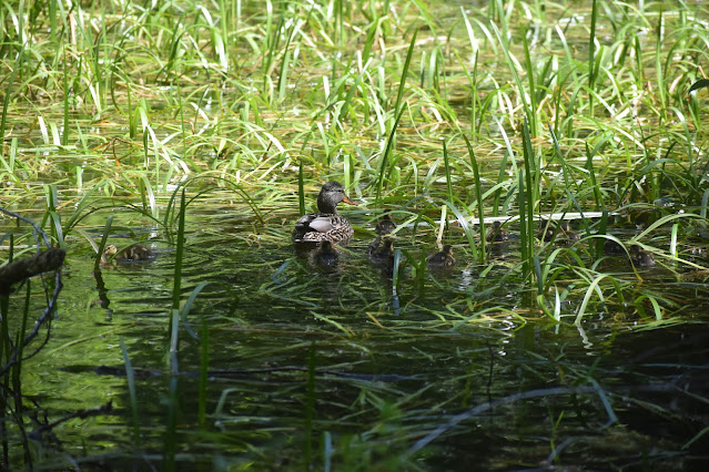 Canada Jays drifted in and out of the trees to ask visitors questions, and ponds near the parking areas held a family of Mallards. Also of note, the flycatcher chorus now included the occasional Hammond's Flycatcher, giving a gravelly call from the canopy of trees.